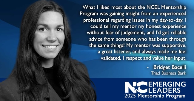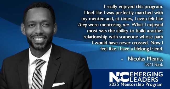 Any member of the NC Emerging Leaders group is eligible to join the program as a mentee. Experienced bankers from all NCBA member banks are encouraged to apply to serve as mentors.