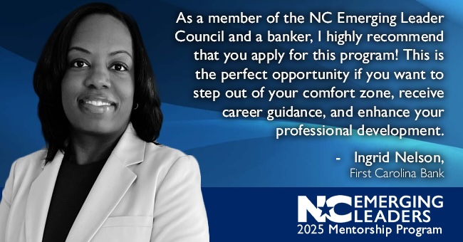 The NC Emerging Leaders Mentor/Mentee Program is a six-month experience designed to connect professionals for honest conversation, career insight, and mutual growth. Whether you’re looking to share your experience or gain perspective from someone who’s been there, this program creates space for meaningful professional relationships to form.